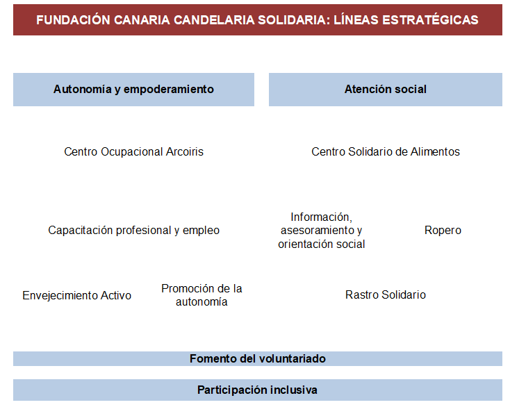 La Fundación Candelaria Solidaria centra su labor en fomentar acciones de interés social y general favoreciendo la mejora continua en los servicios destinados a las partes interesadas, estableciendo los siguientes ejes estratégicos: