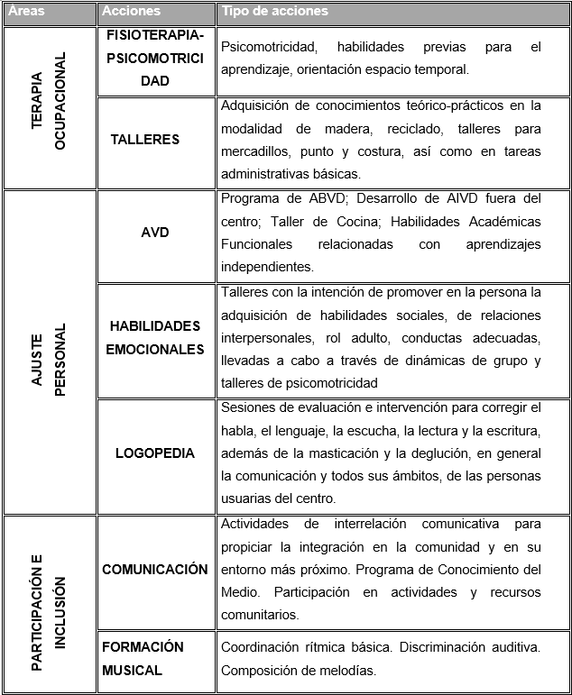Desde el centro ocupacional, tal como se recoge en el Real Decreto 2274/1985 de 4 de diciembre, se desarrollan actividades de terapia ocupacional, habilidades prelaborales y habilitación psicosocial para las personas con discapacidad con dificultades para integrarse en un centro especial de empleo (C.E.E.) o en un empleo ordinario.